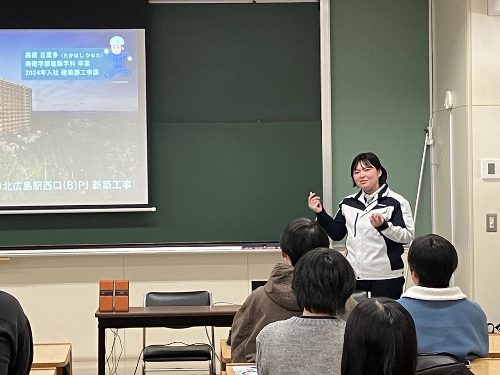 1月30日に行われたアクションプログラムⅥ(建設業界セミナー・3年生対象)では、岩田地崎建設株式会社様にご講演いただきました。その際、2024年3月に本学を卒業した髙橋日菜多さんが来てくれました。