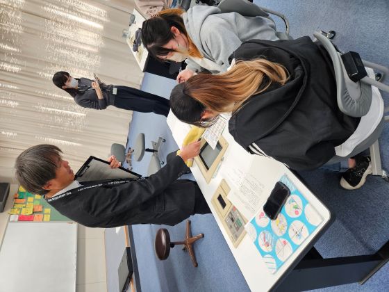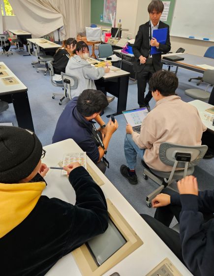学生たちは真剣な表情で説明に耳を傾け、積極的にメモを取りながら質問を交わしていました。質疑応答の場面では、ターゲット層や配布方法、デザインの自由度などについて活発な意見交換が行われ、学生たちの高い関心と意欲が感じられました。