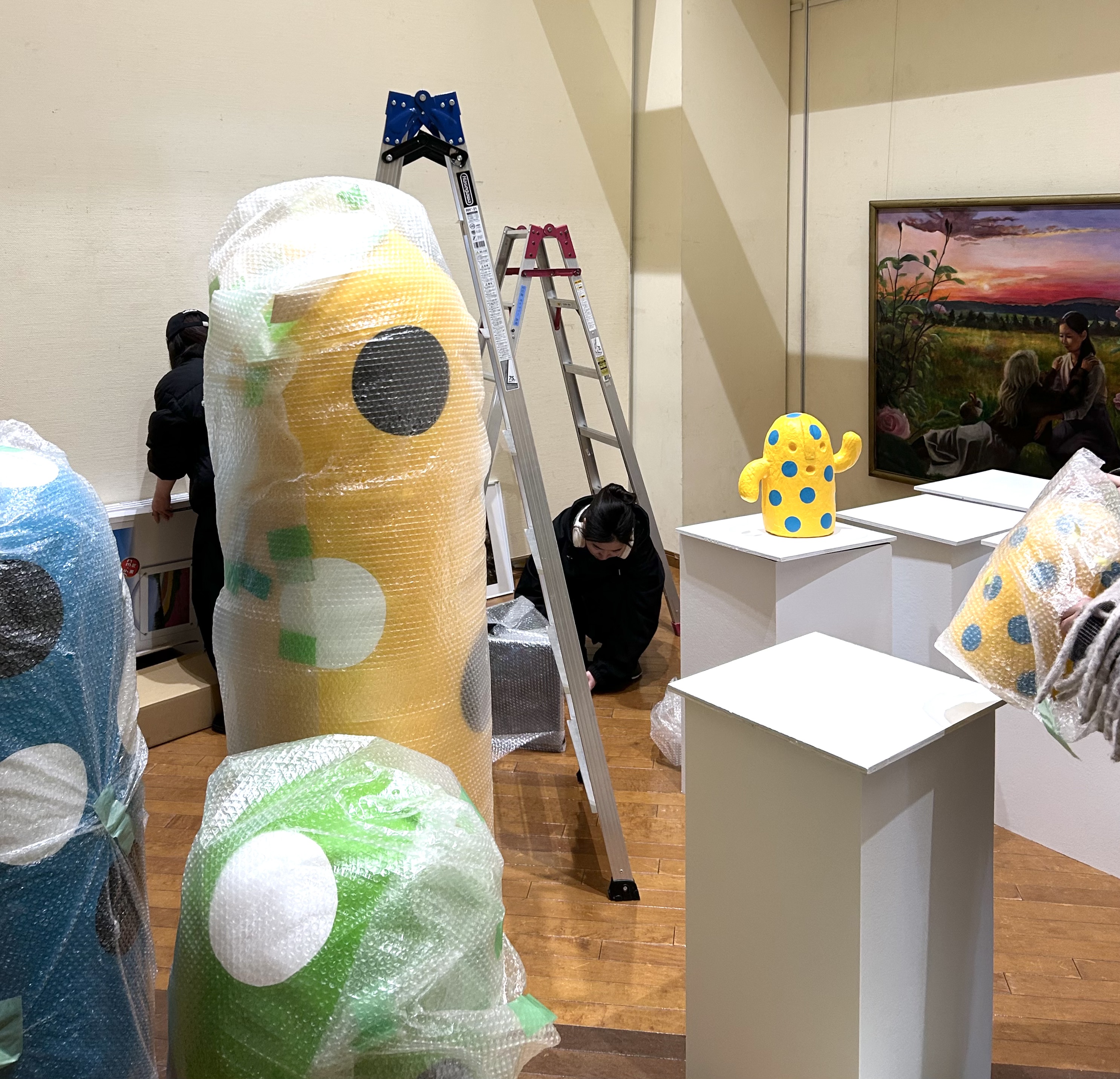 大学から作品を運び出して、会場で受け取り。