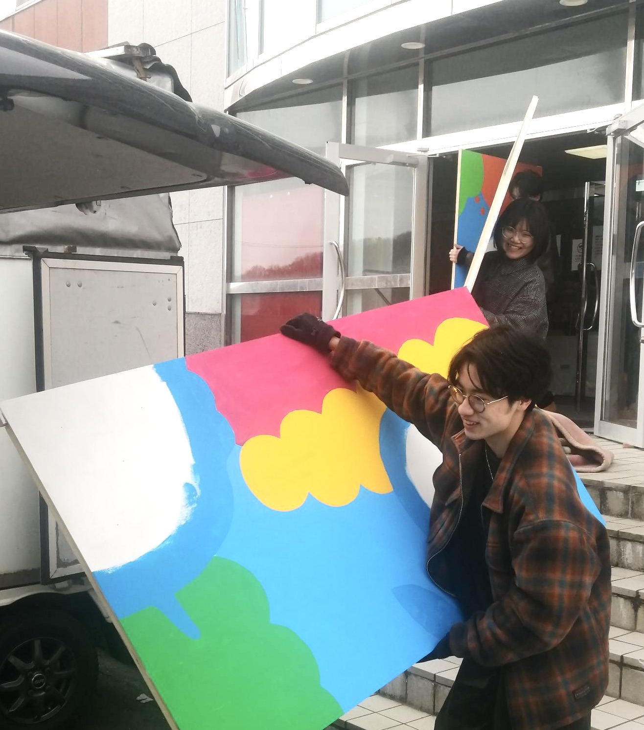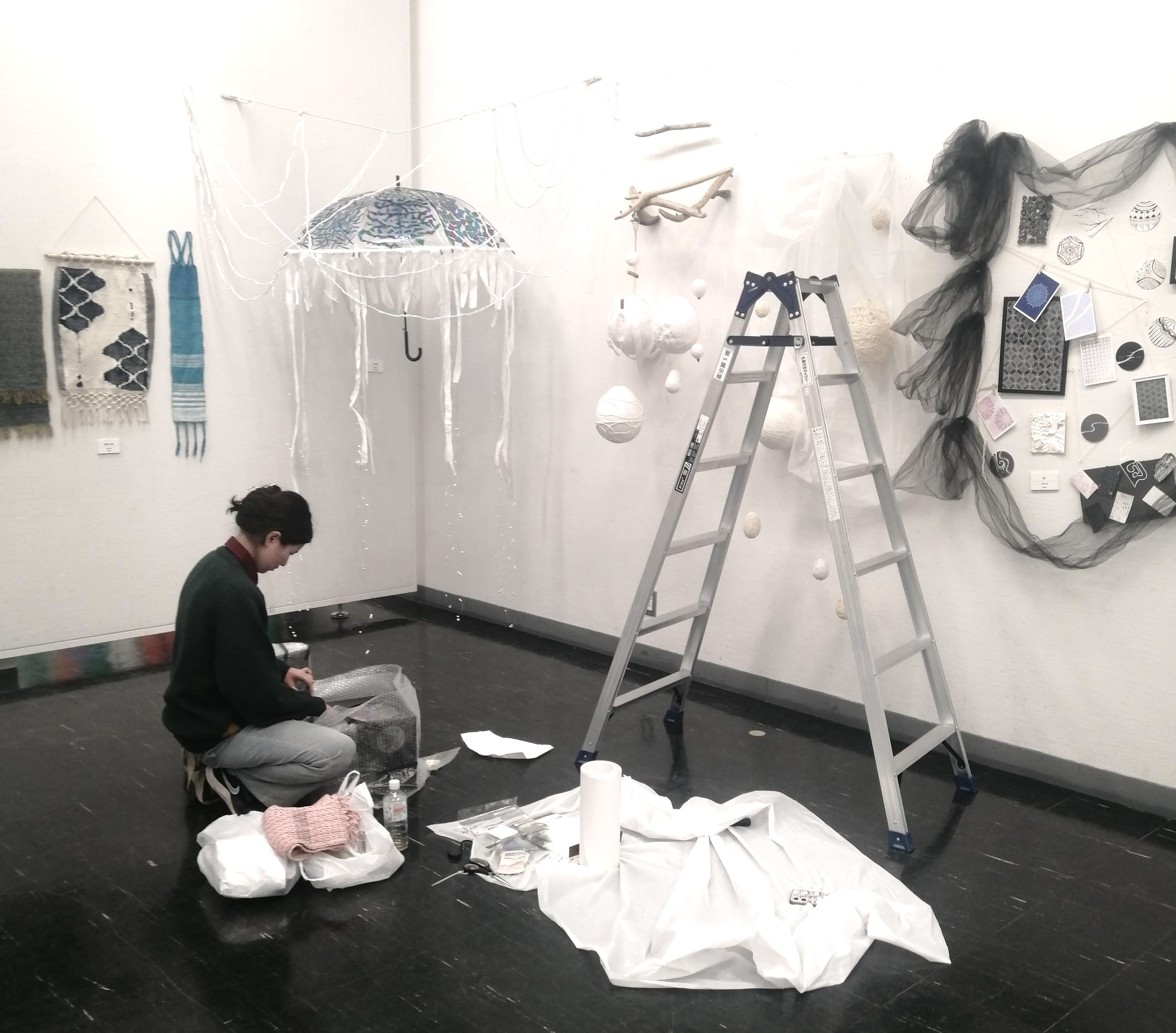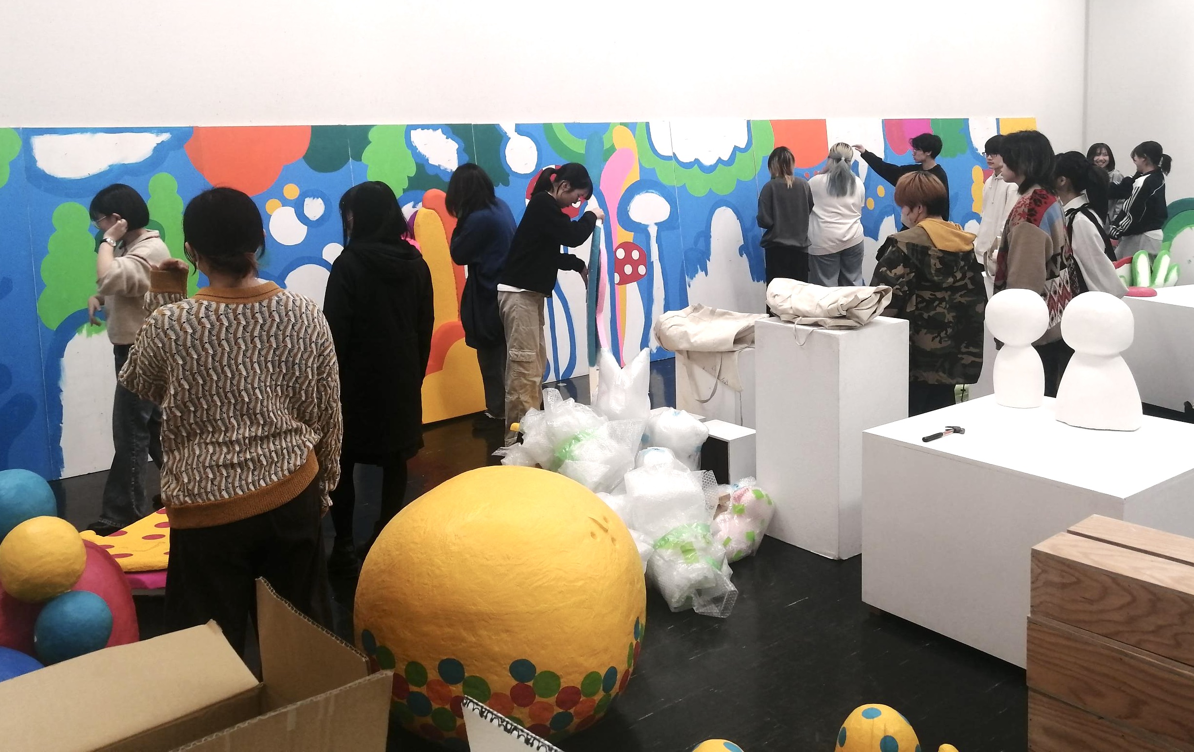 ゼミ在籍中の2年間で作った作品が、ずらり。500M美術館に出品した12メートルの大作も並んでます。