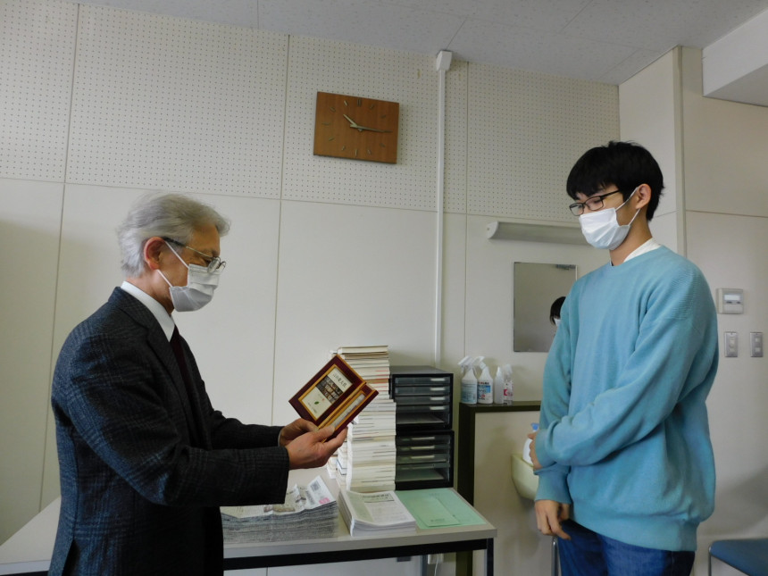 コロナ禍で京都の授賞式は中止となりましたが、本学の 山本一彦学長 にお願いし、記念の盾と副賞の授与式を行いました。