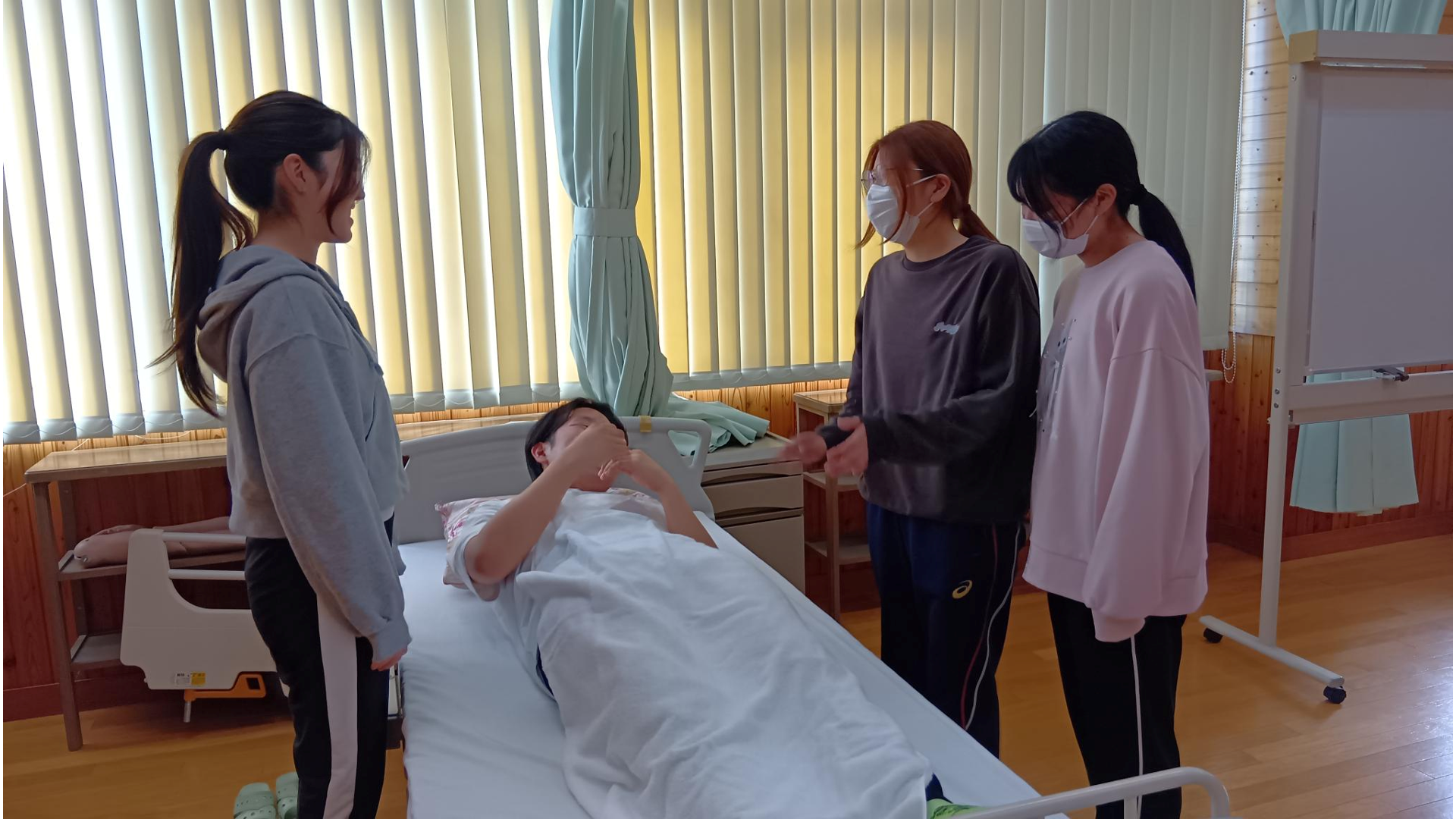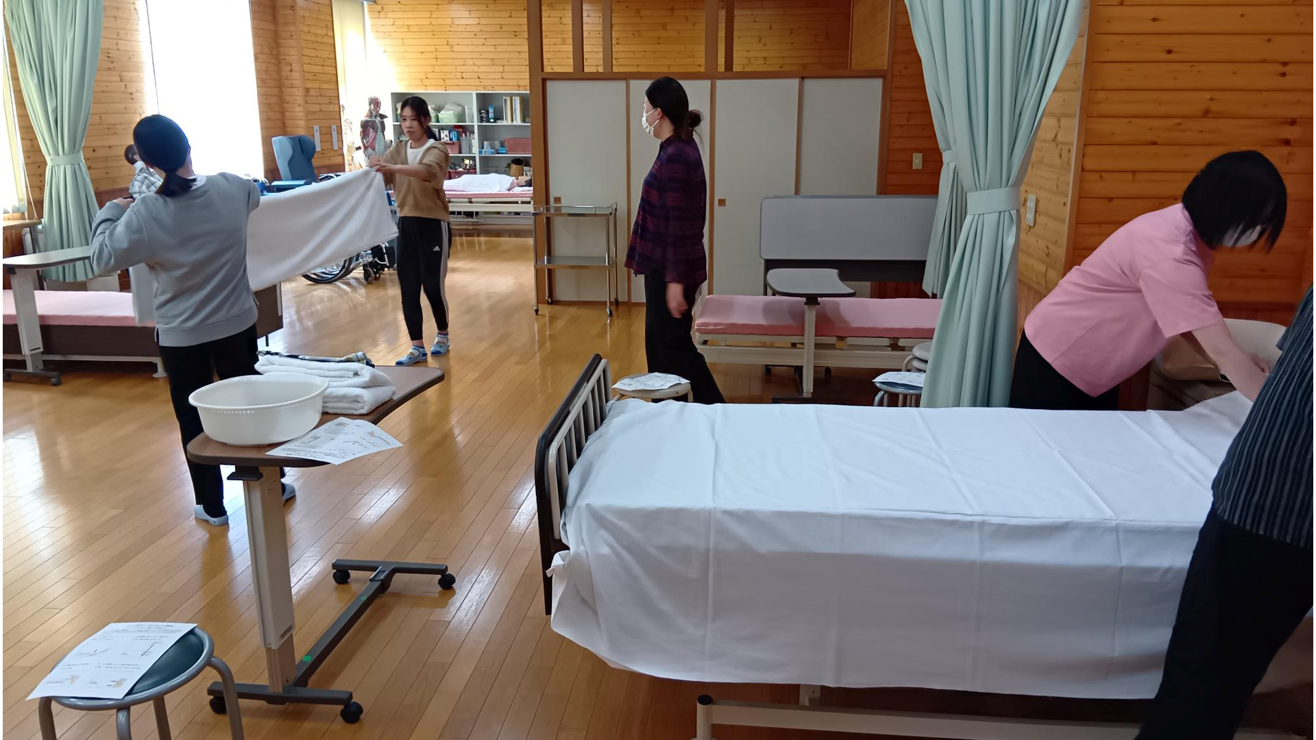 技術演習初回はベッドメイクの実技