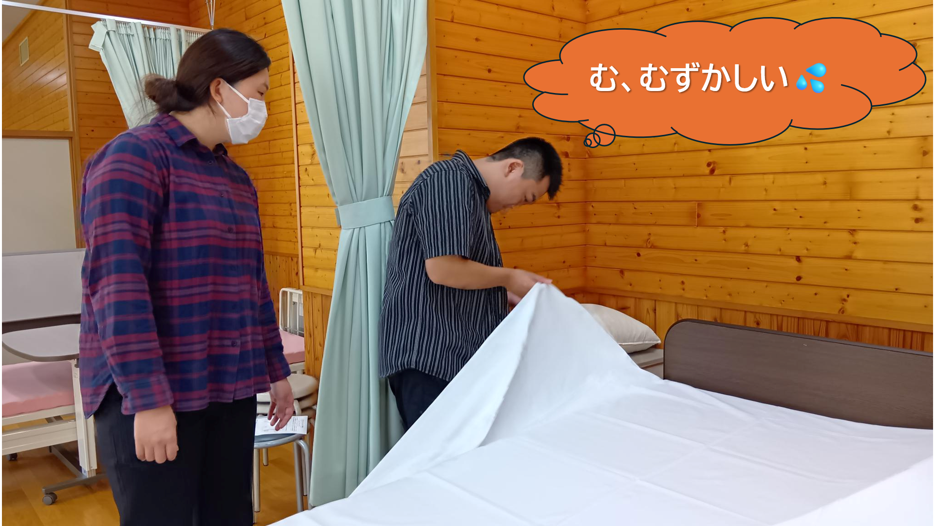 1枚の平シーツを効率よく、しかもシワなくピ―ンと敷く方法を学びました。
