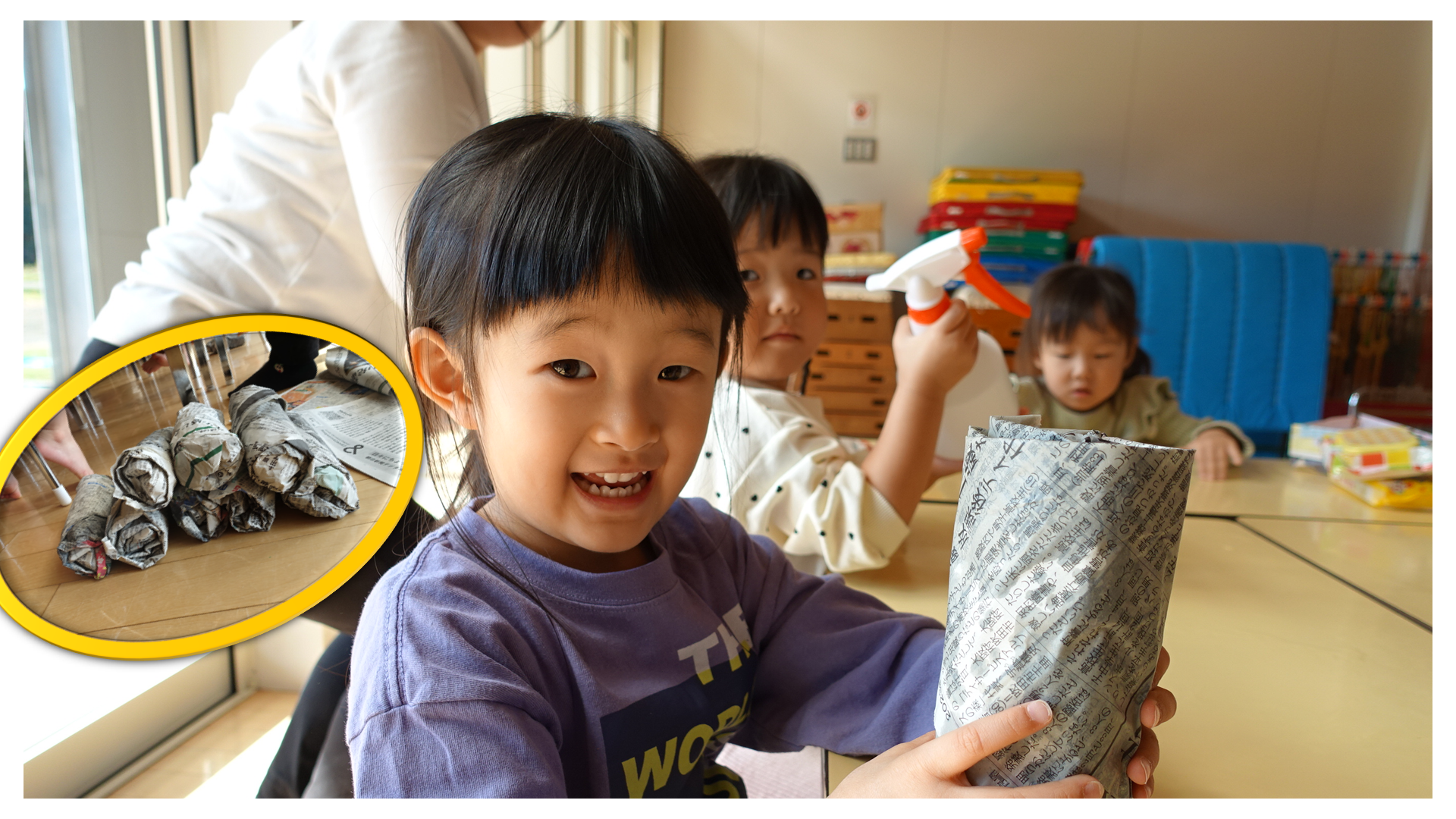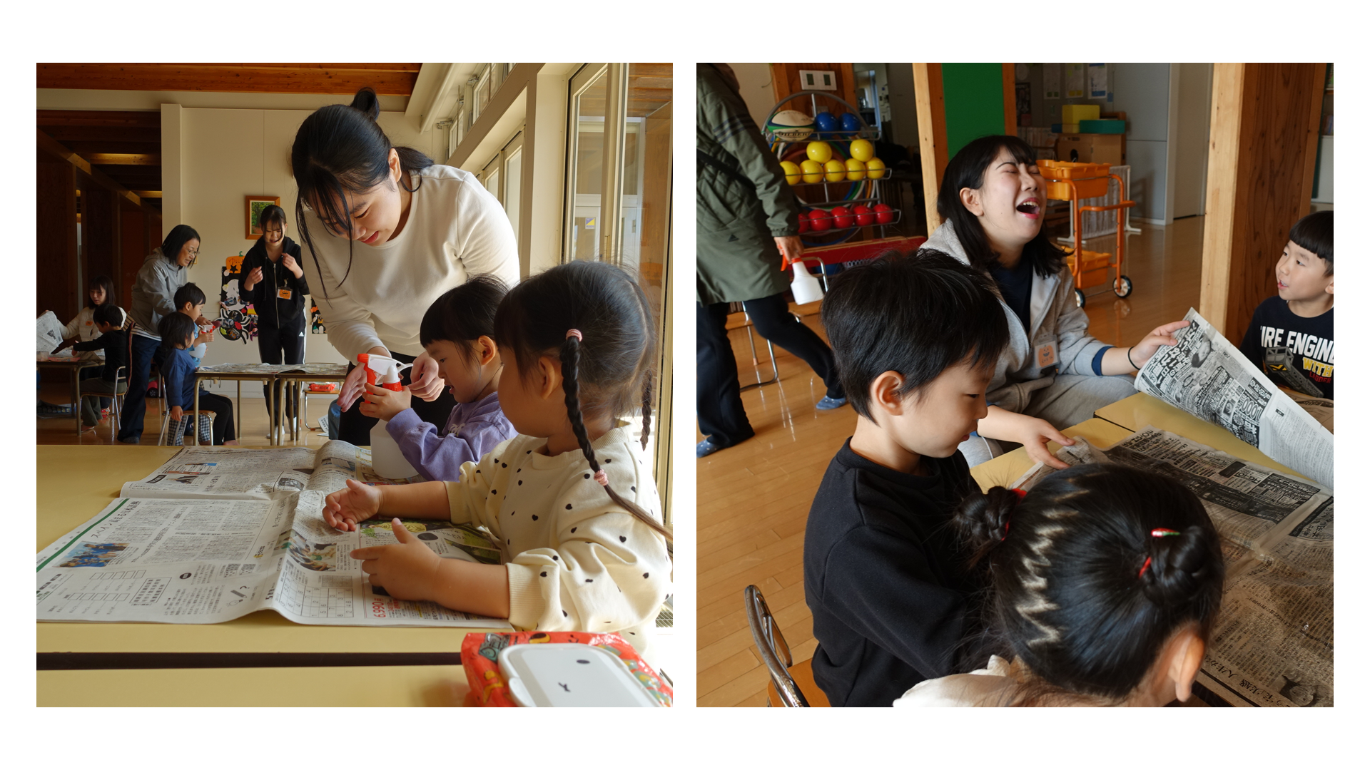 ホールで自己紹介の後、子どもたちのテーブルへ!「よろしくね~」とあいさつして座った後、新聞紙を霧吹きでぬらして水遊びのように⁈