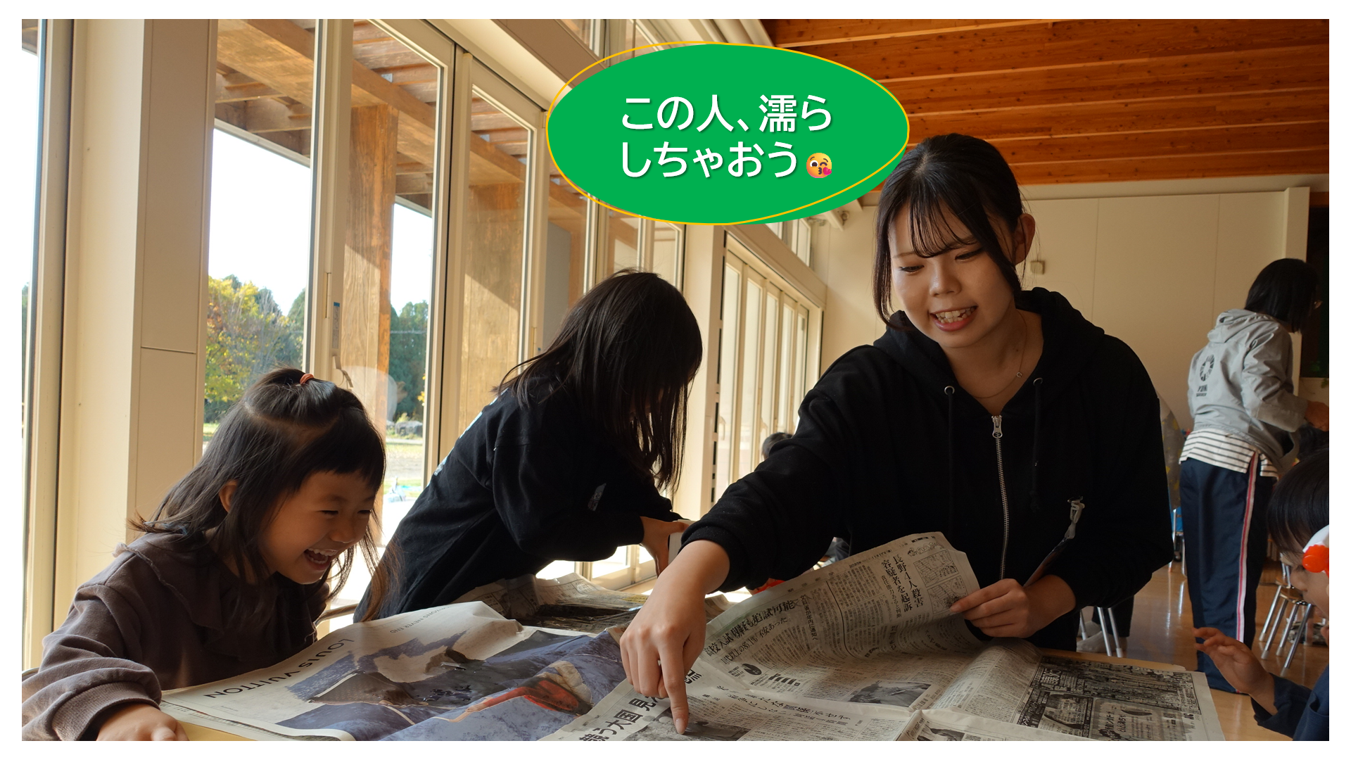 「この人、ぬらしちゃお~!」と学生ならではの遊び心で、子どもと楽しんで芋包み。