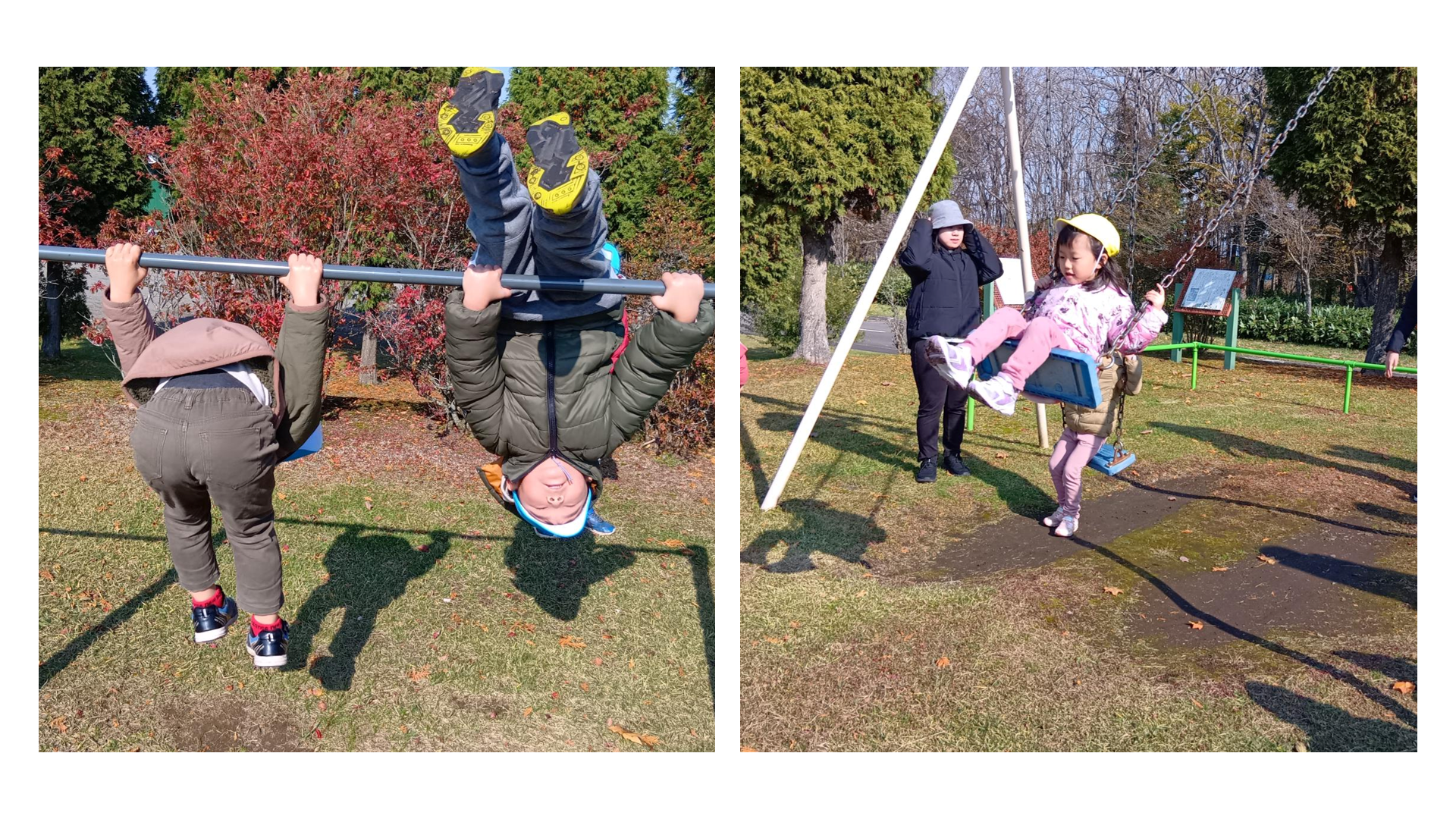 焼けるのを待つ間、追加の落ち葉を拾ったり、ブランコや鉄棒、築山(つきやま=人工的に作られた山デス)を駆け回って遊びました。