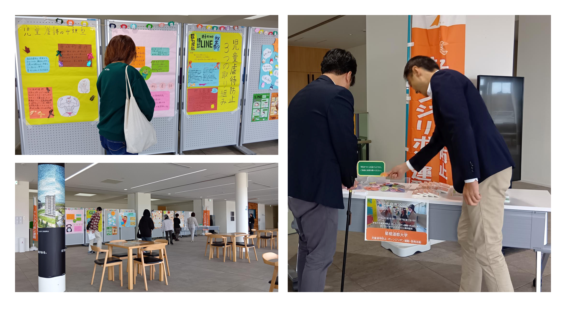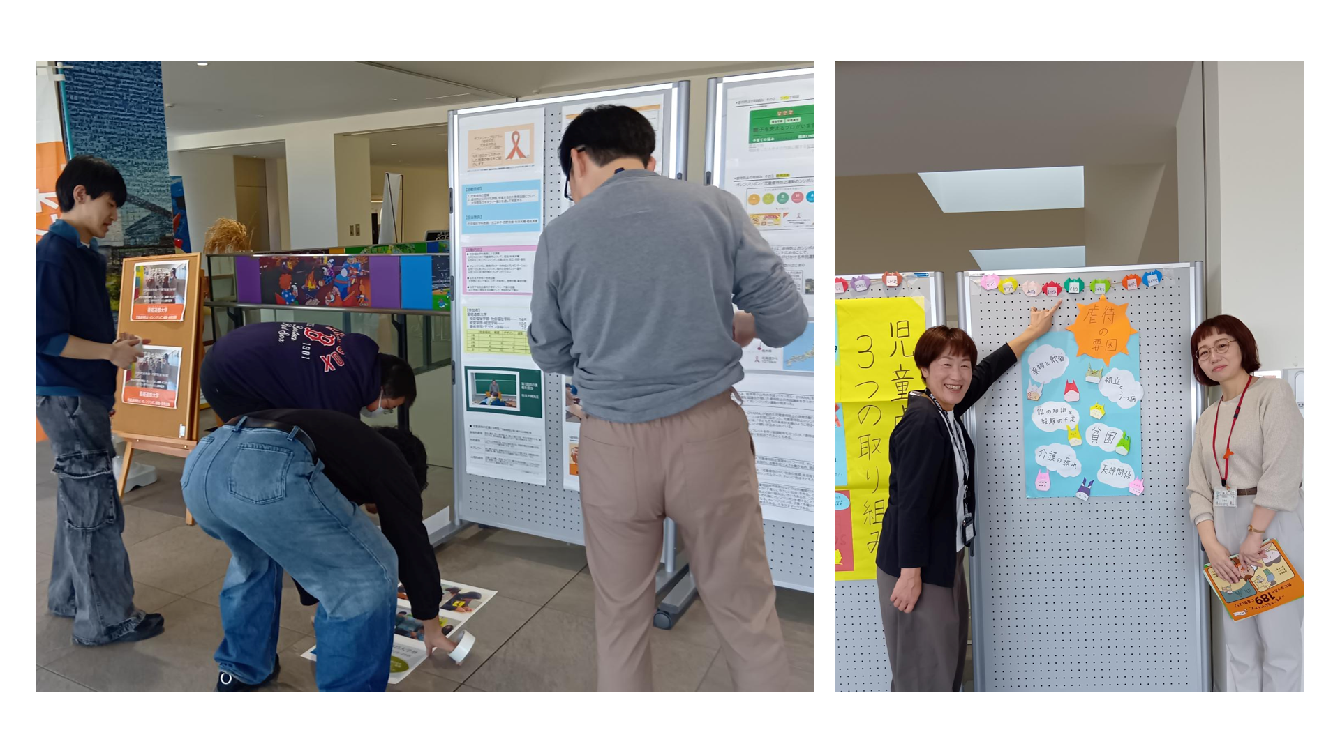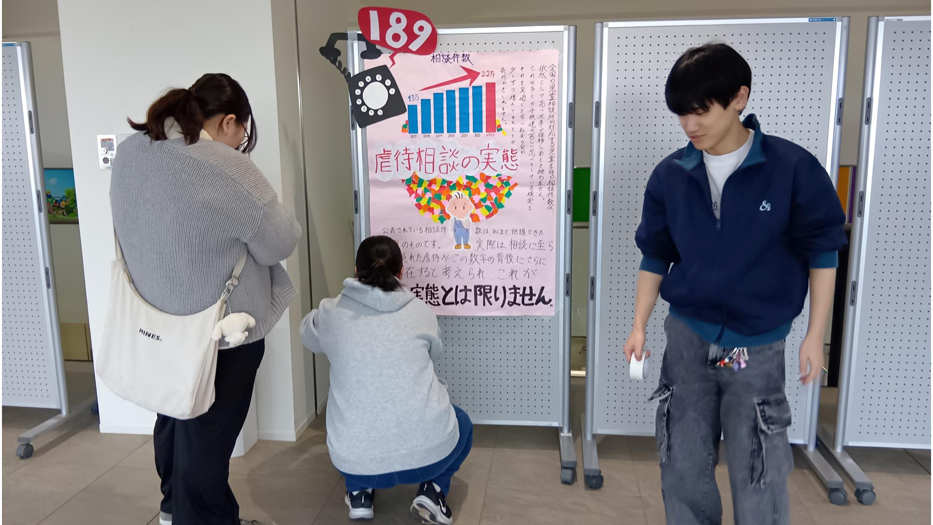 翌日5日からは、北広島市役所5F/市民ギャラリーで3日間、ポスター展示を行いました。朝9時に子ども家庭センター福祉総合相談室の職員や学生たちが集合!