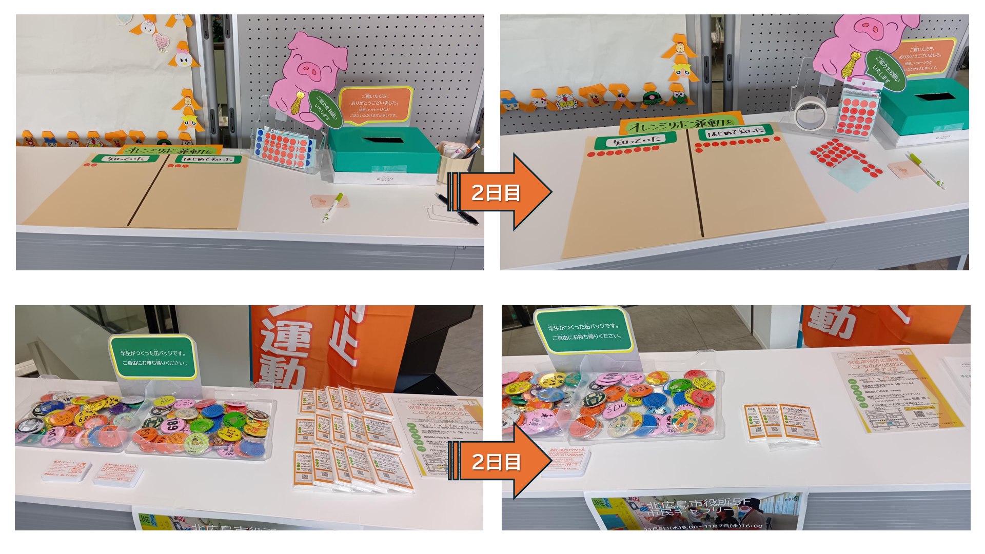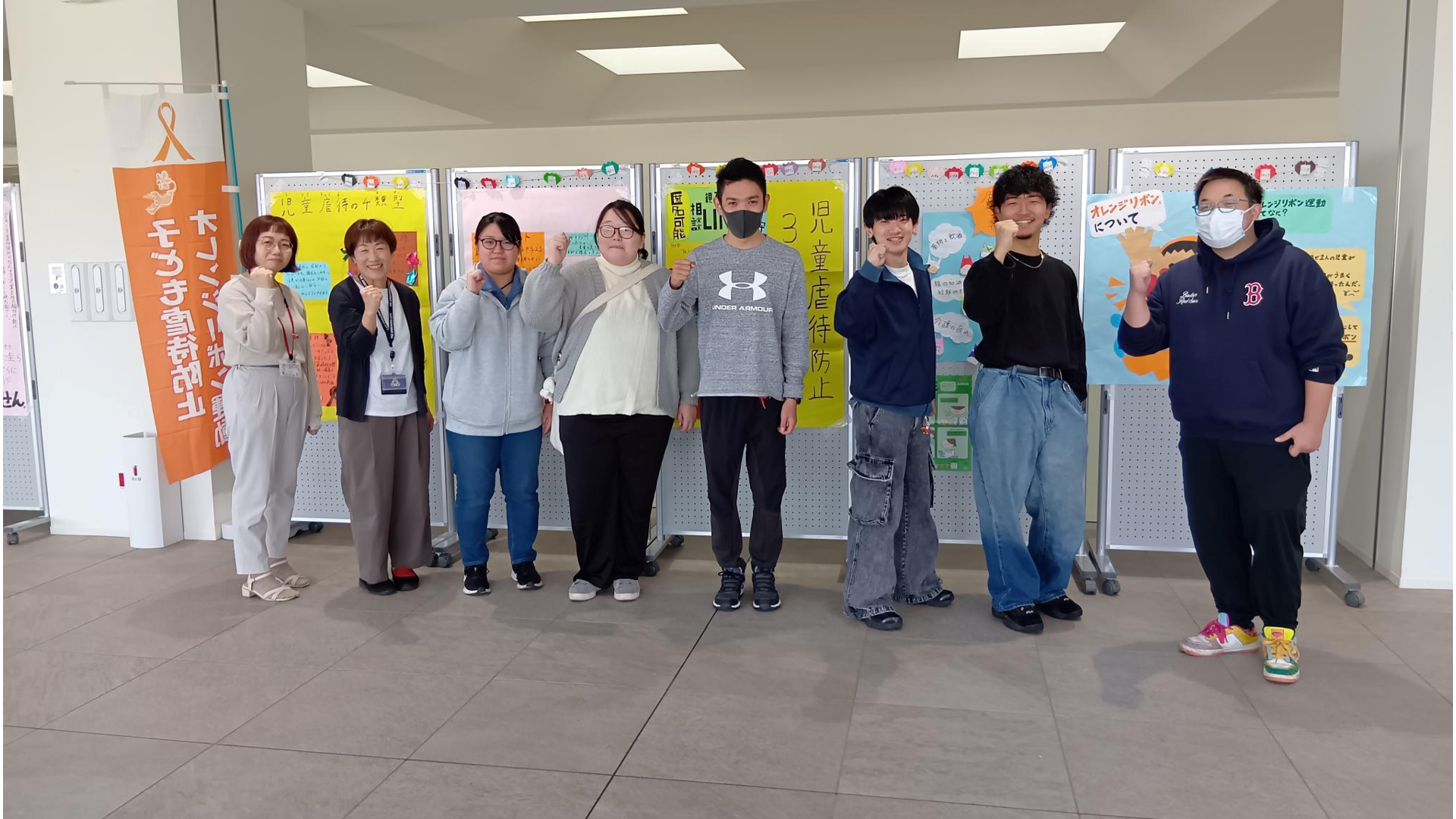 11月4日には上原先生と社会福祉学部の学生たち、北広島市子ども家庭センターが中心となって駅で啓発活動を行いました。