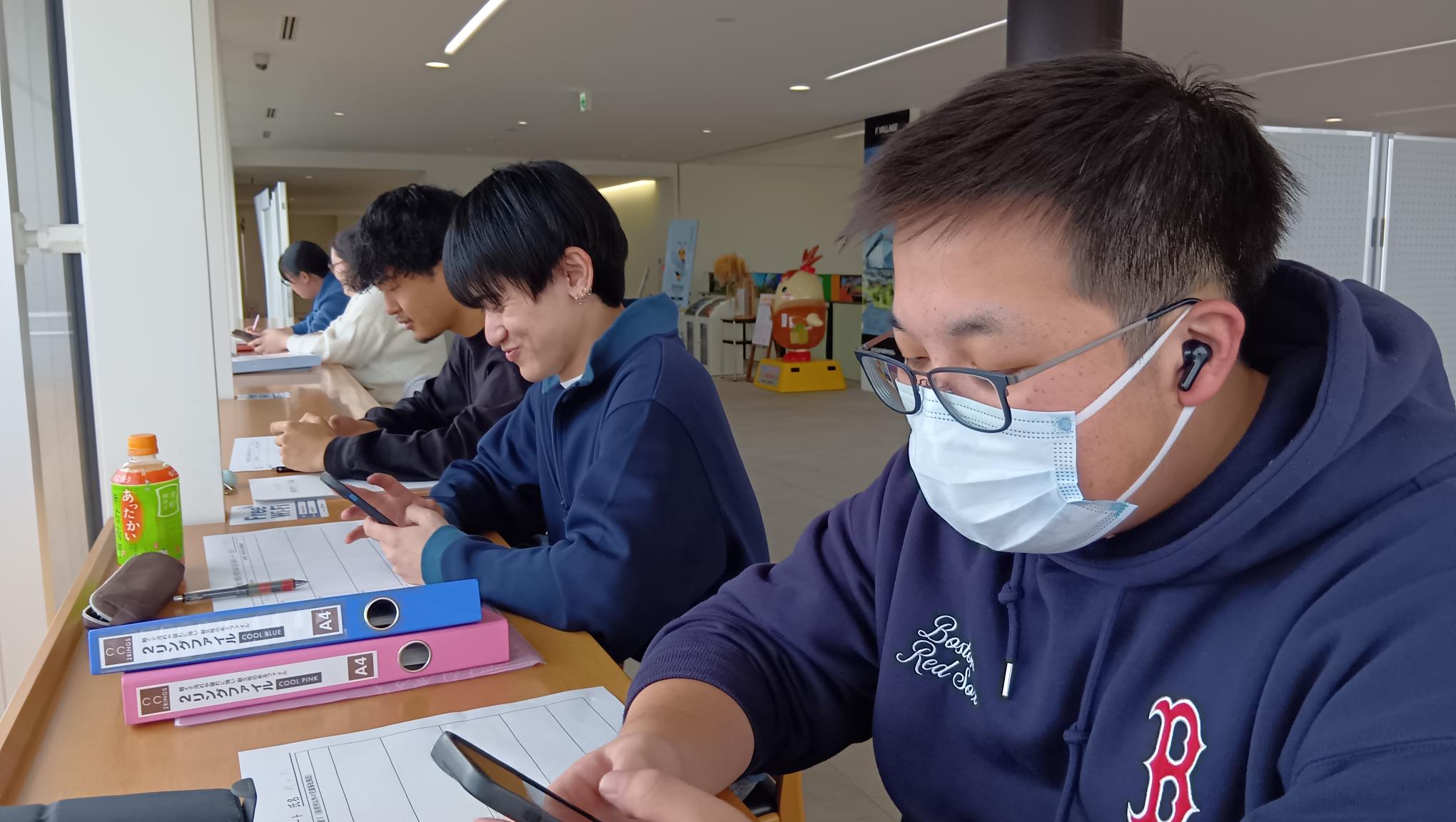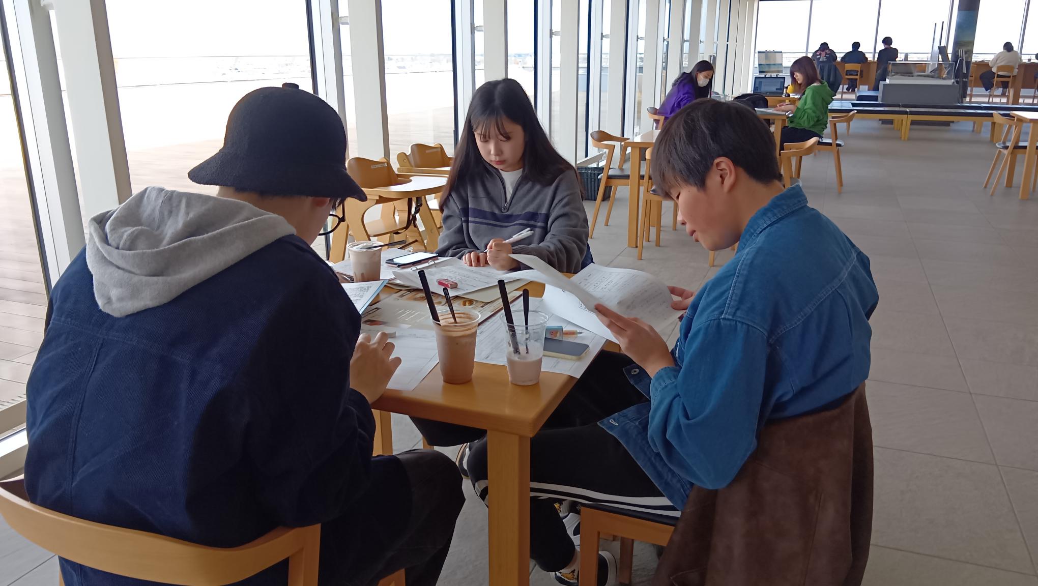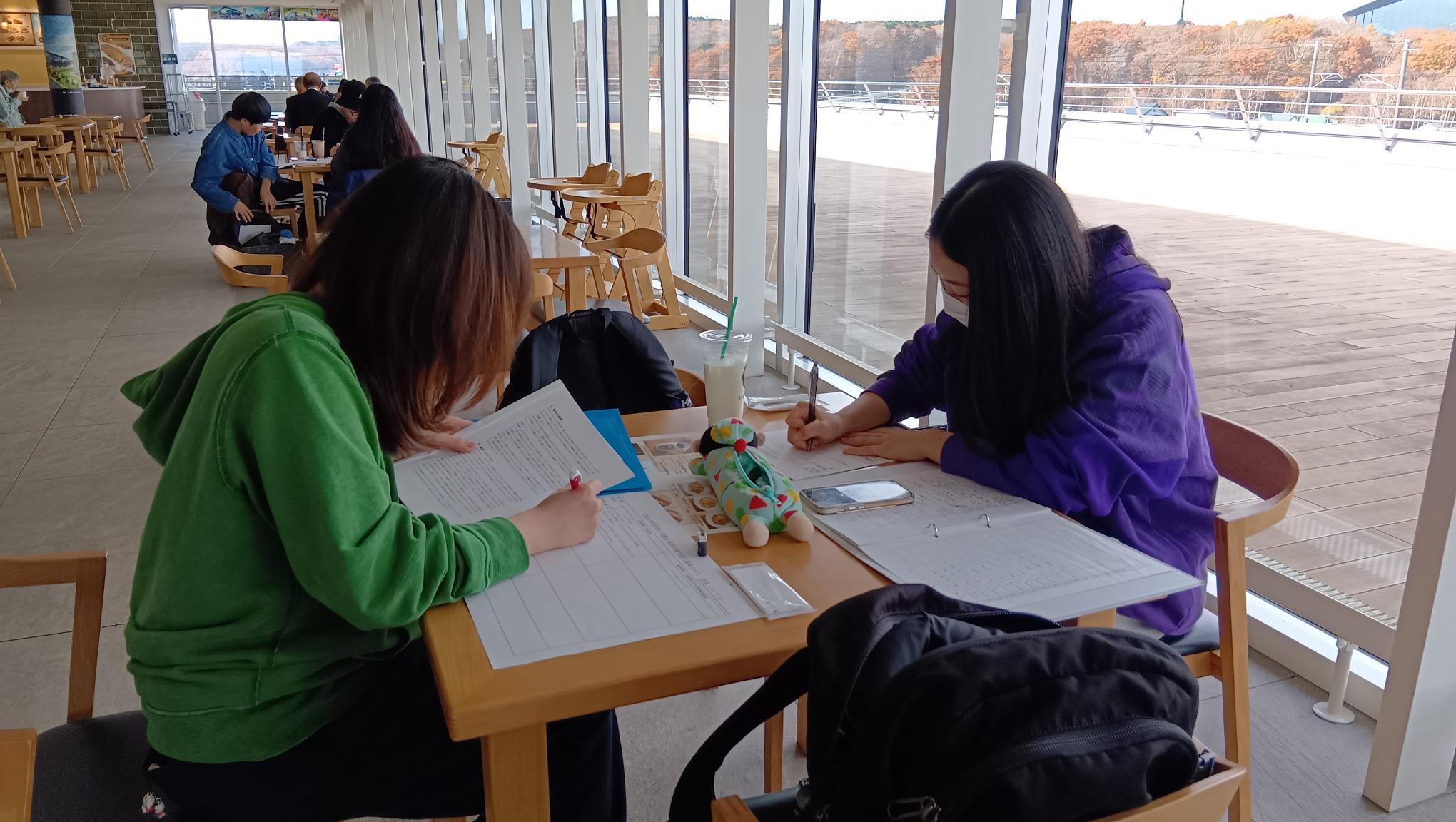 開放感ある場所で、真下しか向いていない学生たちですが、これまでの保育実習の総振り返りをしているところです。