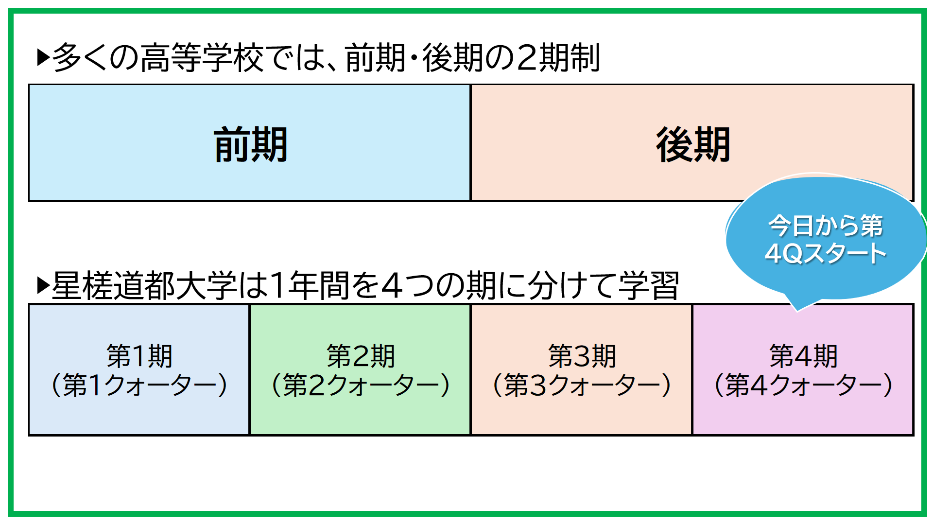 さて、多くの大学や高校が前期・後期の2期制ですが、星槎道都大学は1年を4つに分ける4期制で学んでいます。