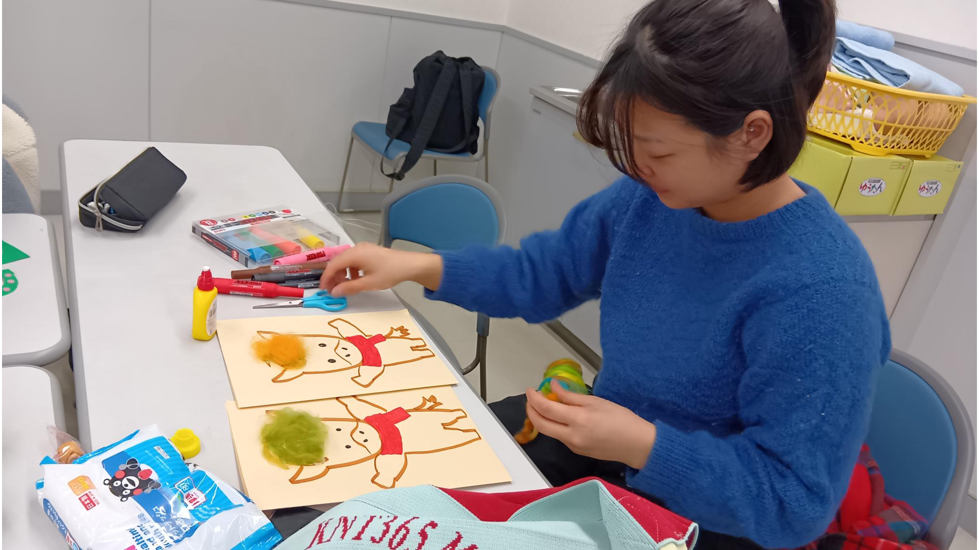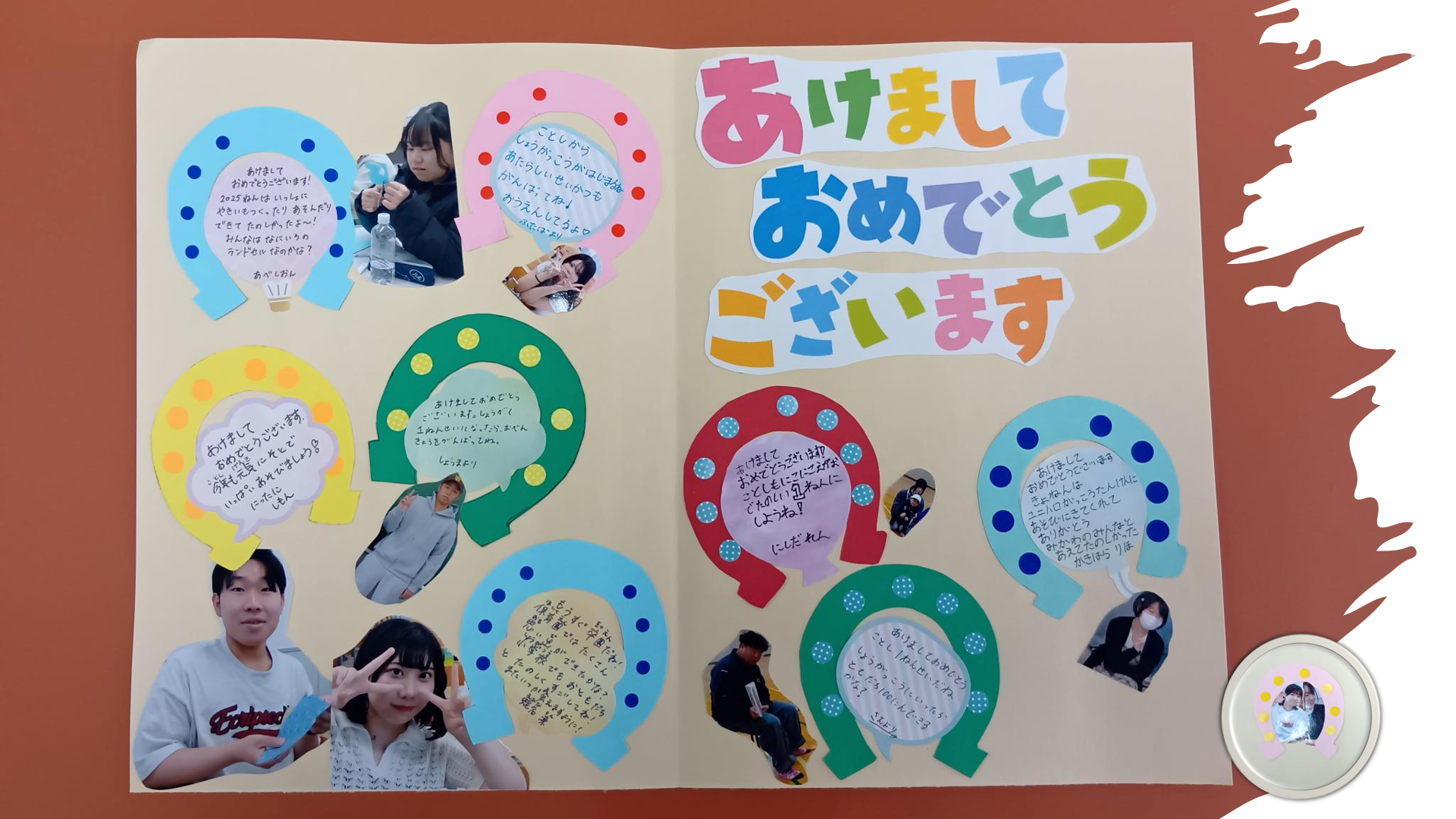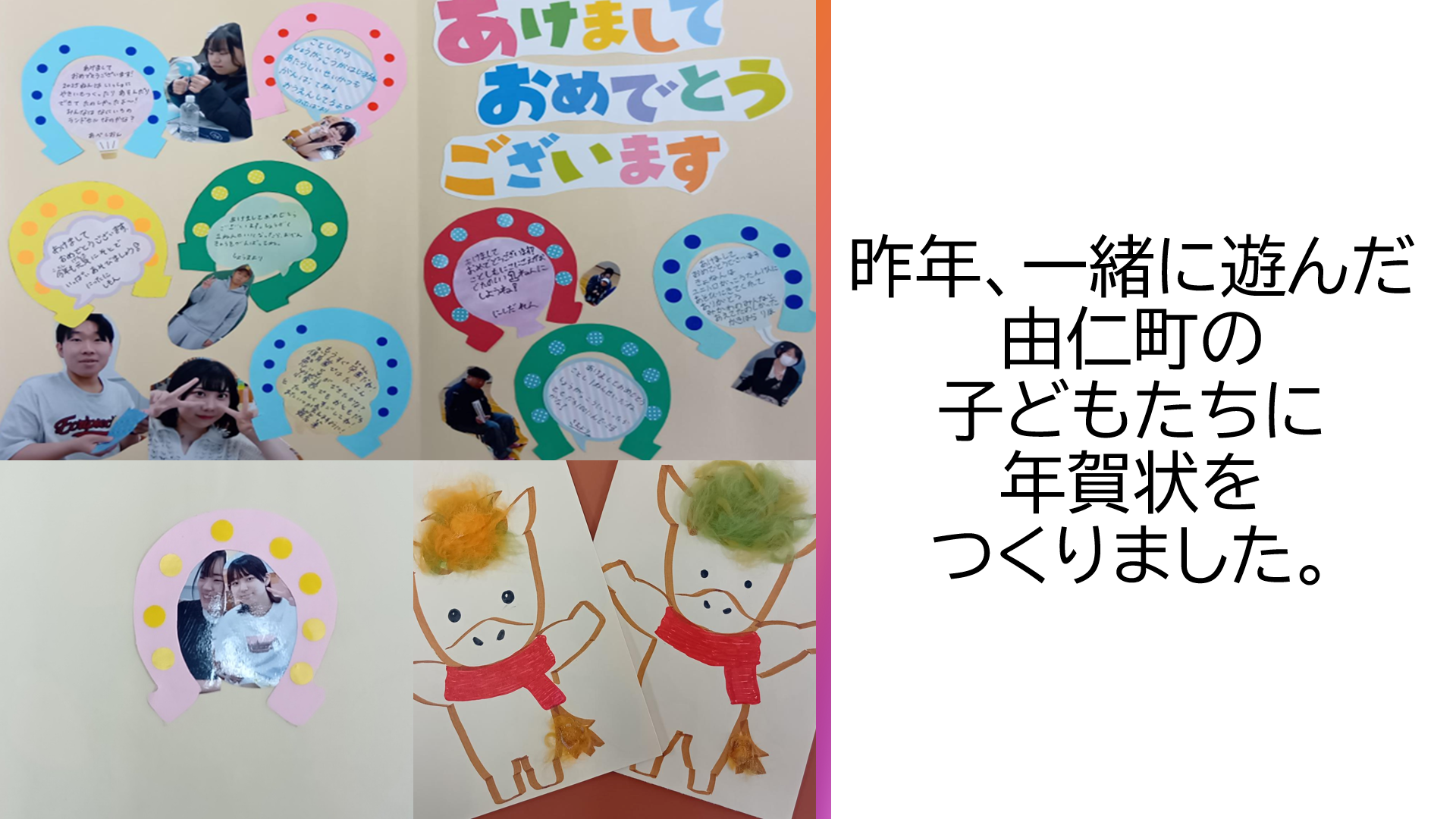 昨年も、七夕会や大学探検など、子どもたちとの交流体験をさせていただいた由仁町のにじいろこども園、三川保育園に大きな年賀状を作りました。