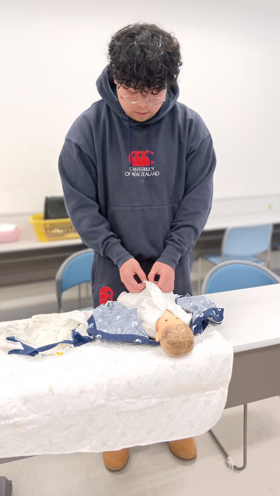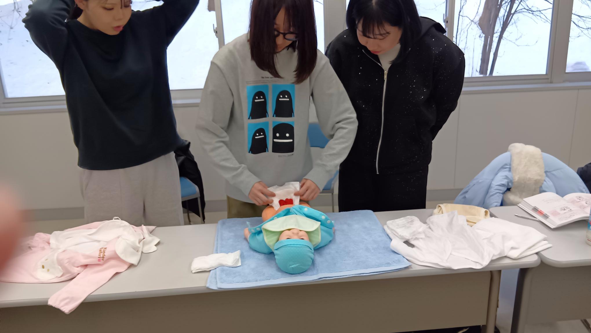 今回は、赤ちゃん人形を使って、衣類の着脱を学びました。