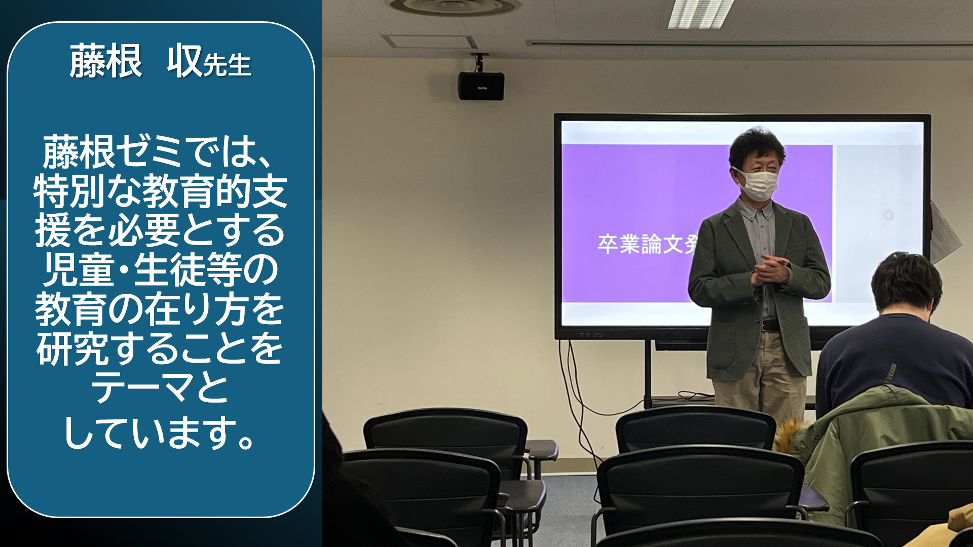 藤根 収先生のゼミは、おもに特別支援教育に関連したテーマで卒業研究に取り組みました。