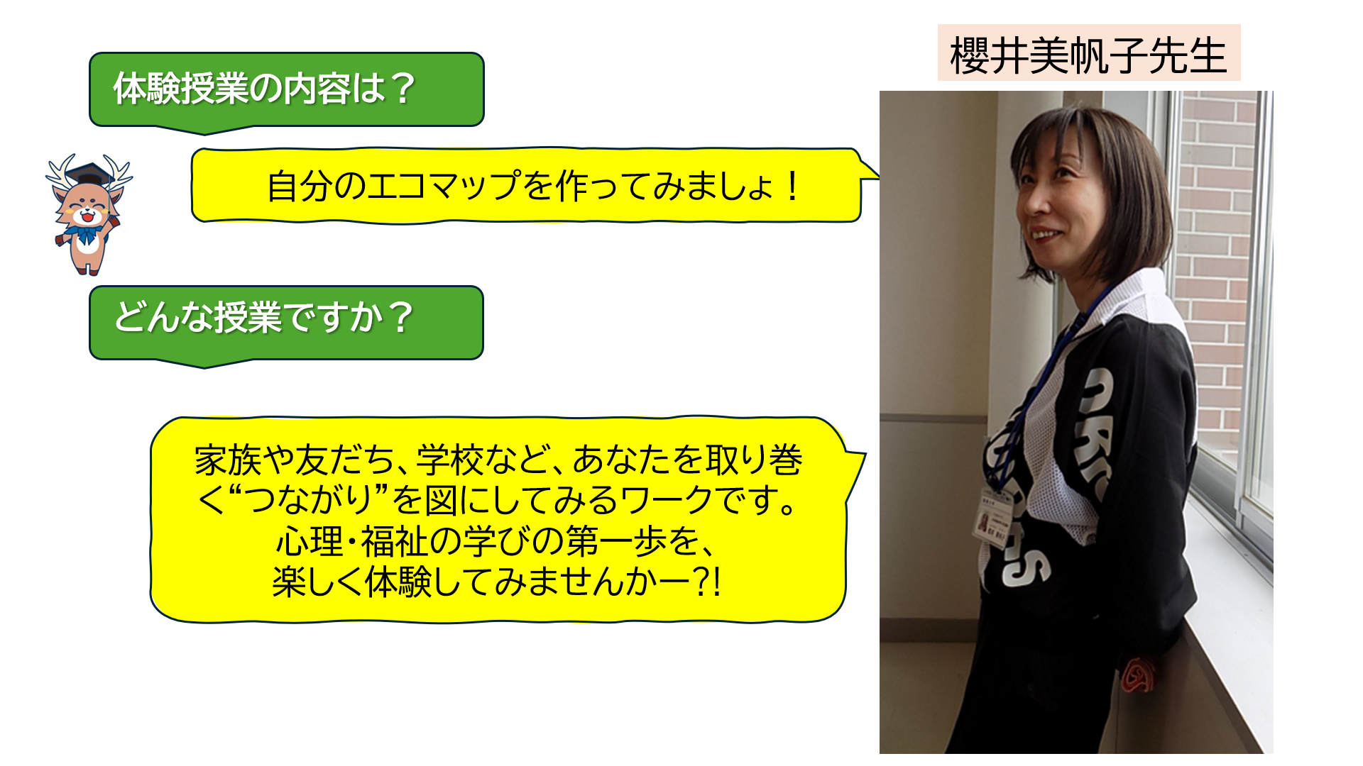 櫻井美帆子先生は、社会福祉系の科目のほか、1年生の「基礎ゼミナール」も担当します。