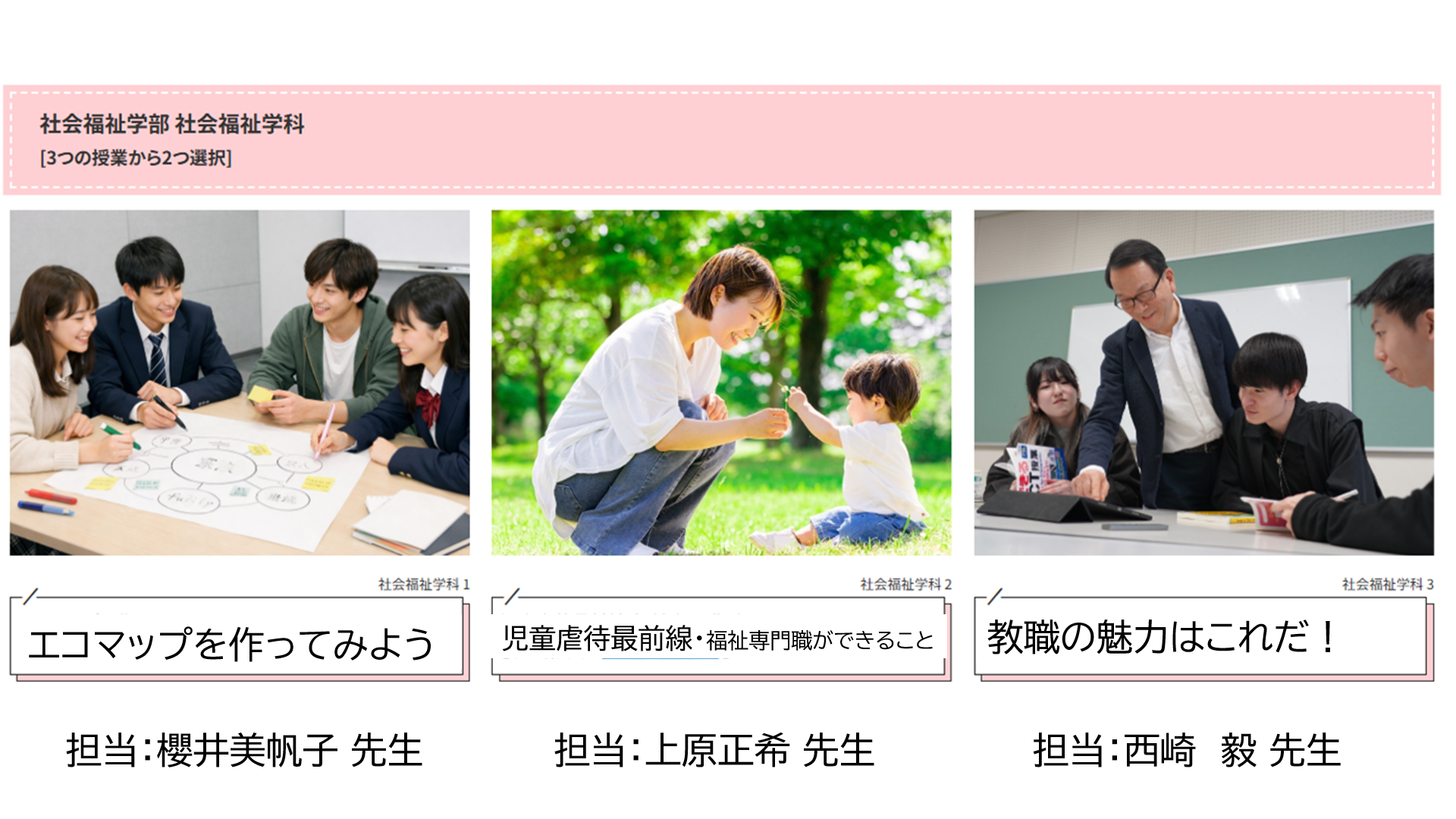 社会福祉学科の授業体験は、櫻井美帆子先生、上原正希先生、西崎毅先生が担当します。