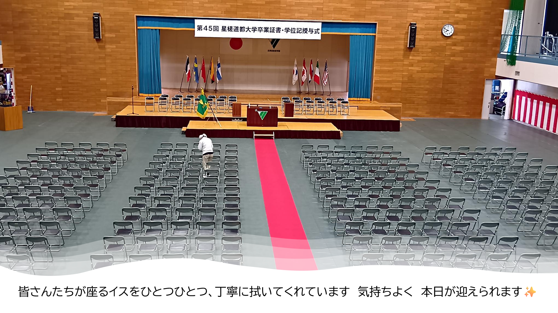 準備が整った会場では早朝から、一人ひとりのイスをきれいに清掃✨