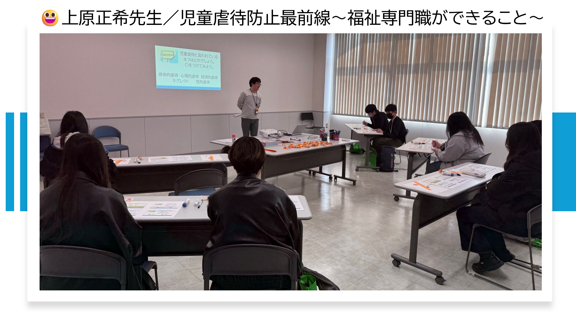 上原正希先生の授業では、児童虐待防止に関する話、職員の役割、さらには防止活動の一環として「オレンジリボン運動」の演習も行われました。