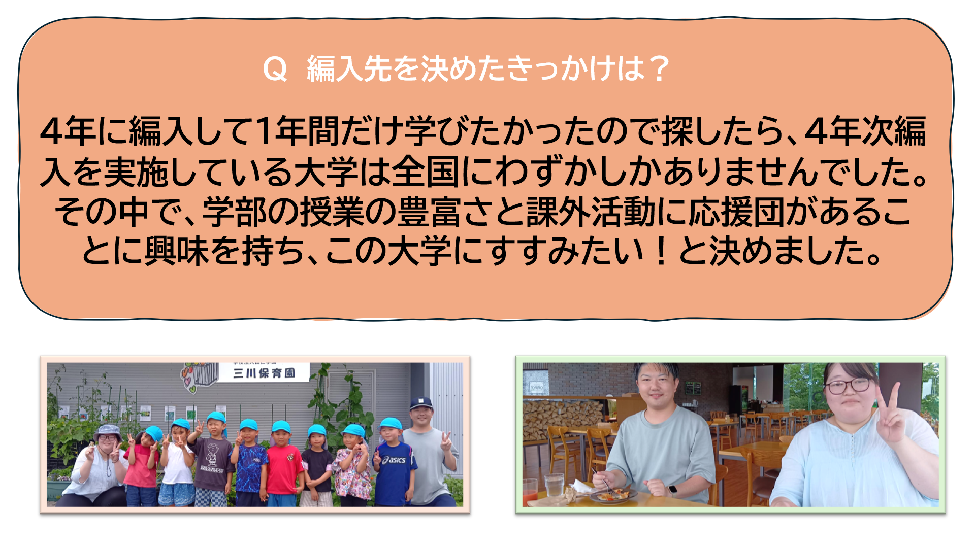 編入学は、何年次に編入するかによって在学する期間が選べて、その中で専門的な先生と関われたり大学生ならではの貴重な経験ができたりします。