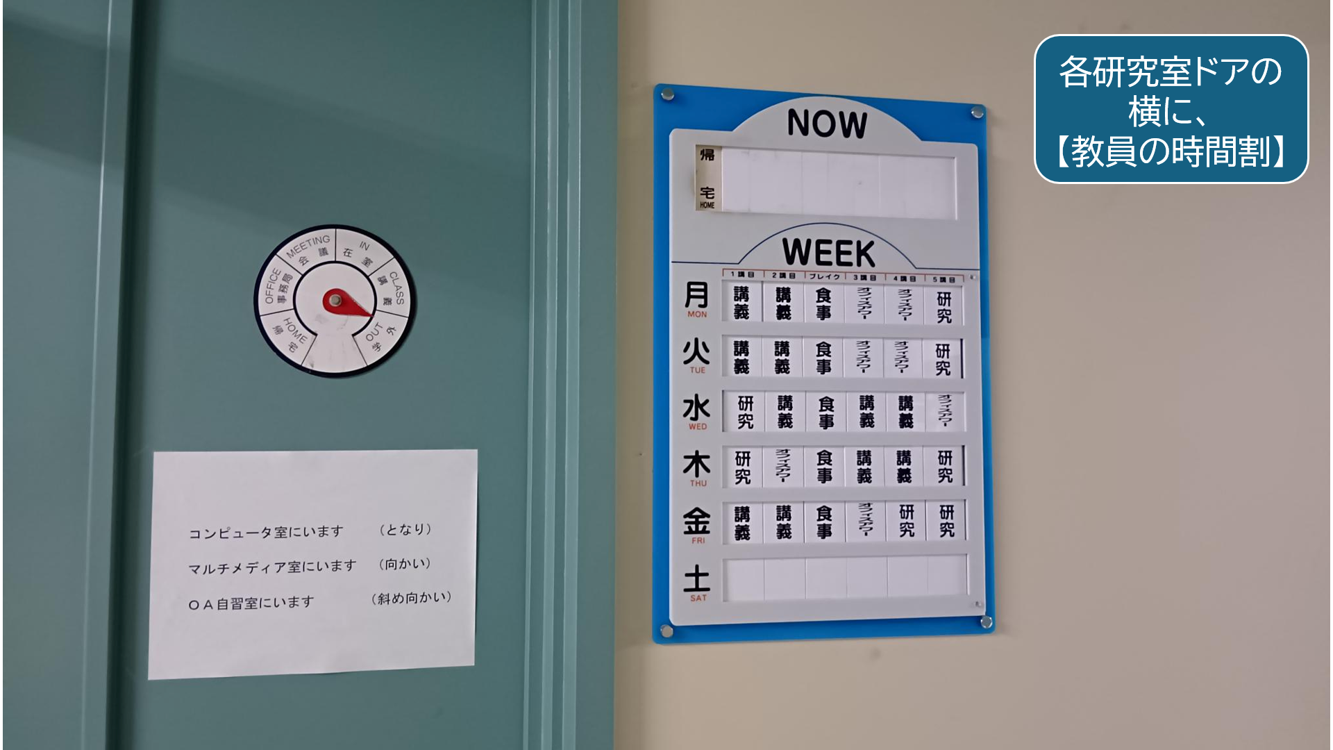 講義以外で「オフィスアワー」と表示されている時間帯は、学生が訪問して相談したり質問したりできます(^-^)