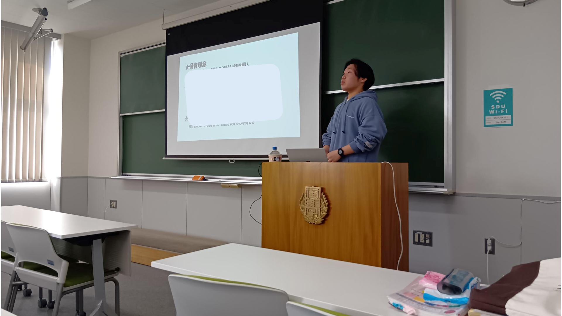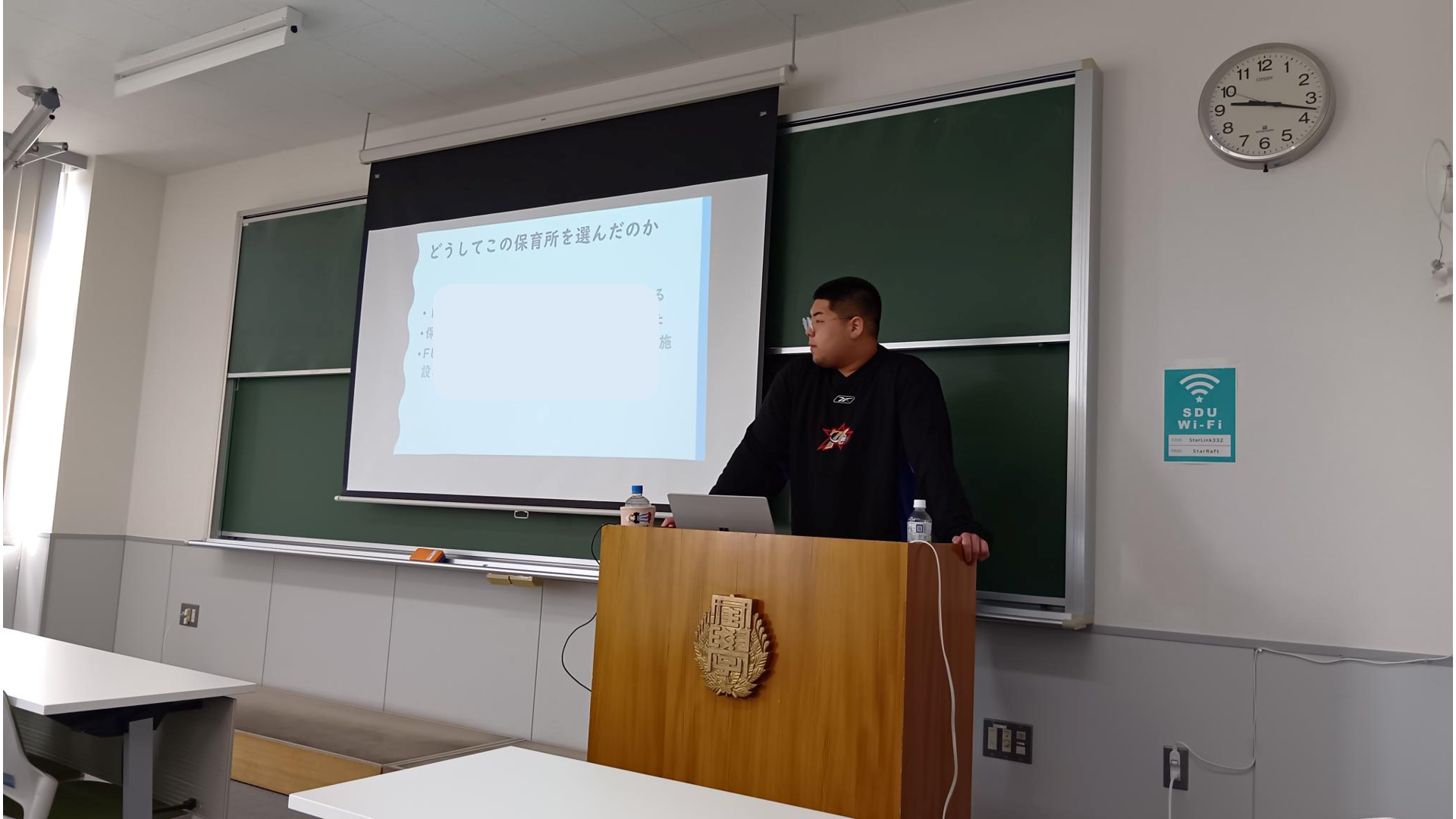 どんな場所にあるのか、大切にしている保育理念は何か、自分の実習目標は何か、実習までに克服したい課題は何かなどを全員がプレゼンテーション。