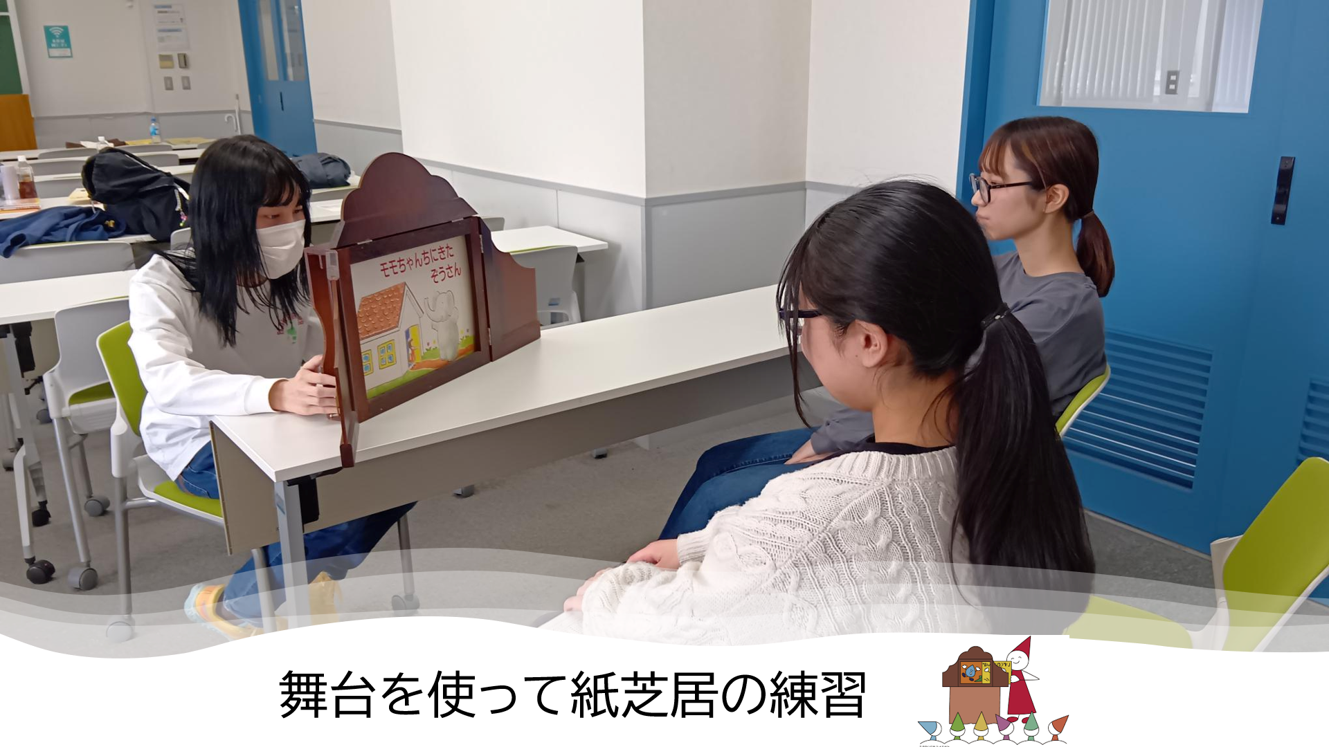 紙芝居は、たま~に舞台を使う実習施設もあるため、大学内で体験!