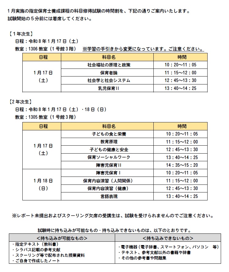 【指定保育士養成課程】科目修得試験 時間割のご案内