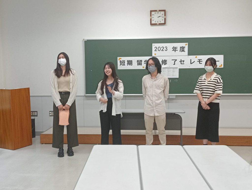 かるた大会の後は、吉江先生からかるたの授与と、何と修了書の授与が行われました。この日のために吉江先生と社会福祉学科の学生がメッセージカードと修了書を準備してくれていました。暖かいプレゼントに、留学生4名も大感激!最後のあいさつでは感極まって泣いてしまう留学生もみなさんのやさしい気持ちと、留学生4名の「寂しい」という気持ちが伝わり、私まで泣きそうになってしまいました
