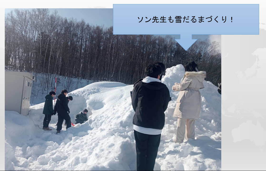 かまくらを作ったり、雪だるまを作ったりしながらソン先生と会話を楽しみました。