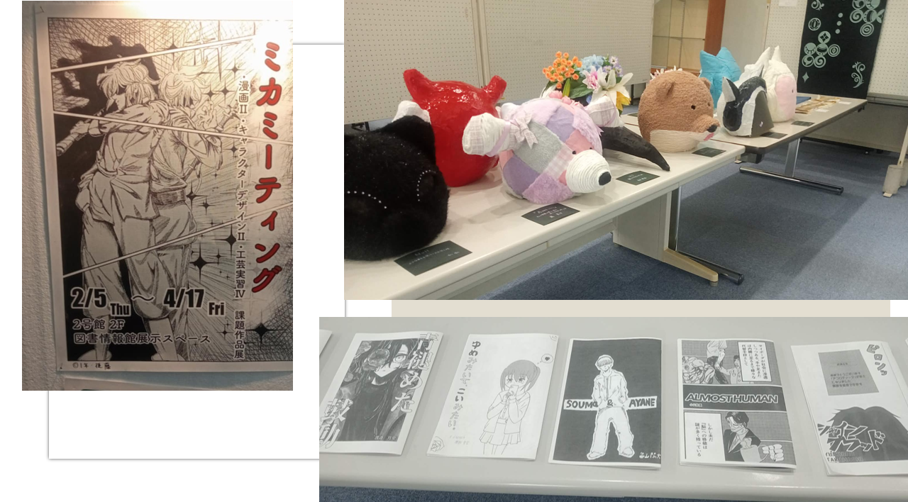 デザイン学科の三上先生が担当されている「漫画Ⅱ」「キャラクターデザインⅡ」「工芸実習Ⅳ」を受講した学生の作品がずらりと並びます。